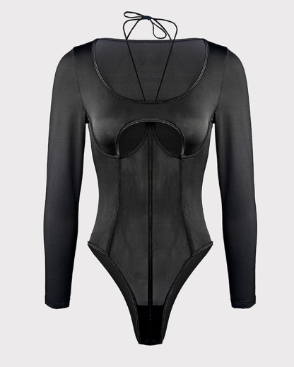 Mesh See-Through Hollowed-Out Long-Sleeved Underwire Bodysuit