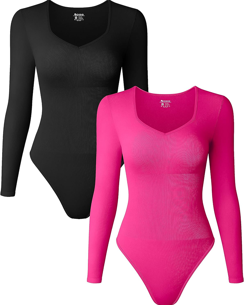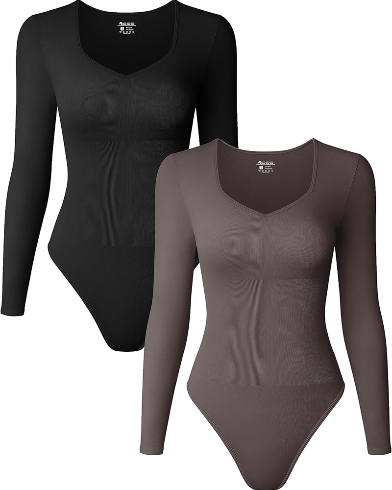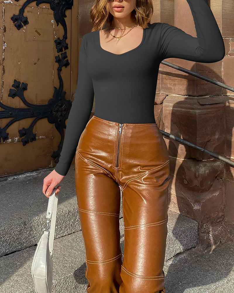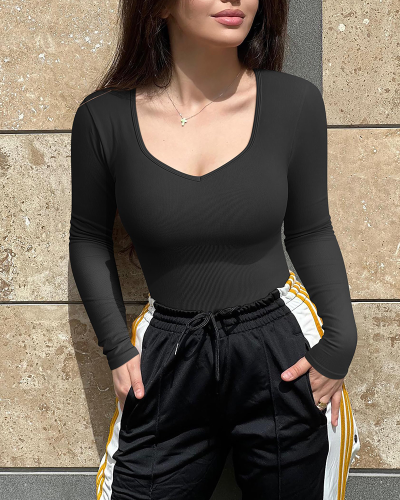 Sweetheart V Neck Ribbed Long Sleeve Bodysuit