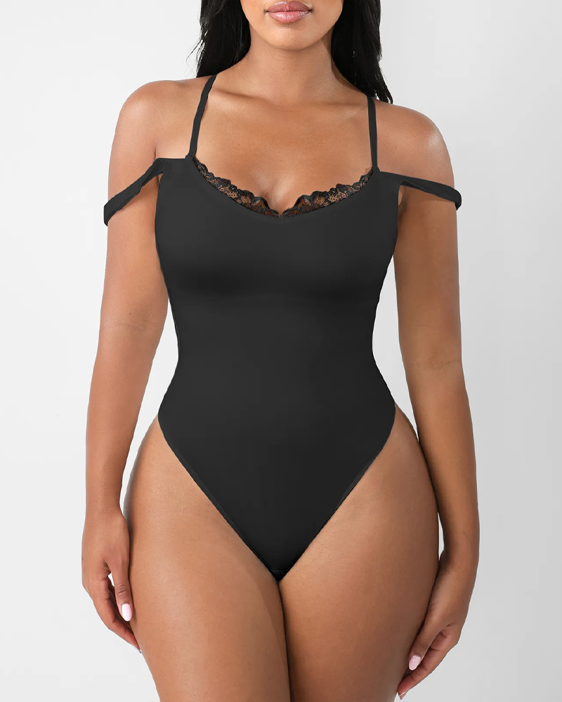 Comfortable V-Neck Lace Waist-Cinching Thong Bodysuit (Pre-Sale)