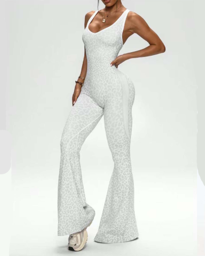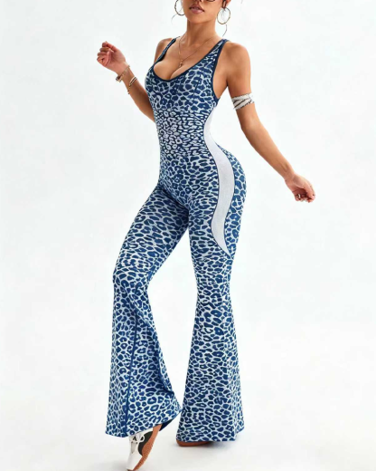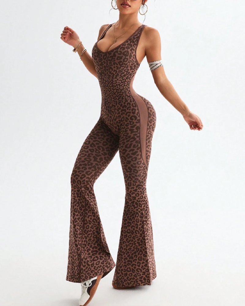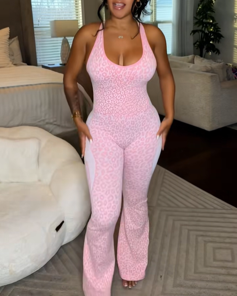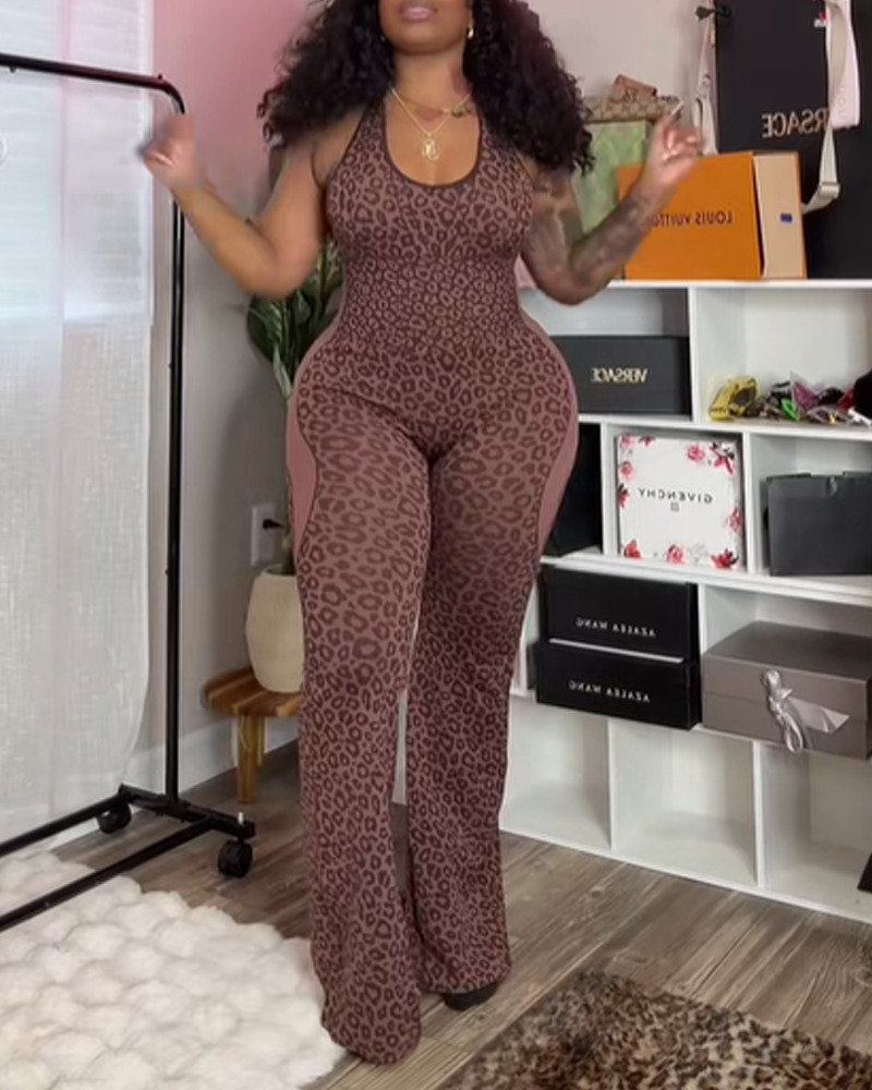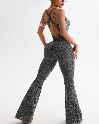 Leopard Print Criss-Cross Backless Seamless Flared Jumpsuit