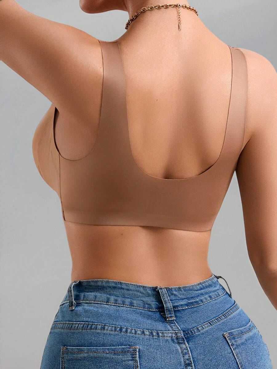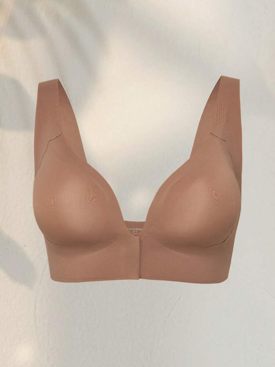 Seamless Solid Color Front-Opening Push-Up Bra with Padding and Sexy Deep V